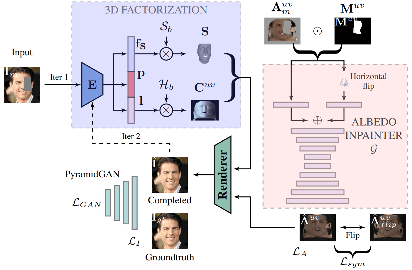 3DFaceFill is an iterative inpainting approach where the masked face is disentangled into its 3D shape, pose, illumination and partial albedo by the 3DMM module, following which the partial albedo, represented in the UV space is inpainted using symmetry prior, and finally the completed image is rendered.