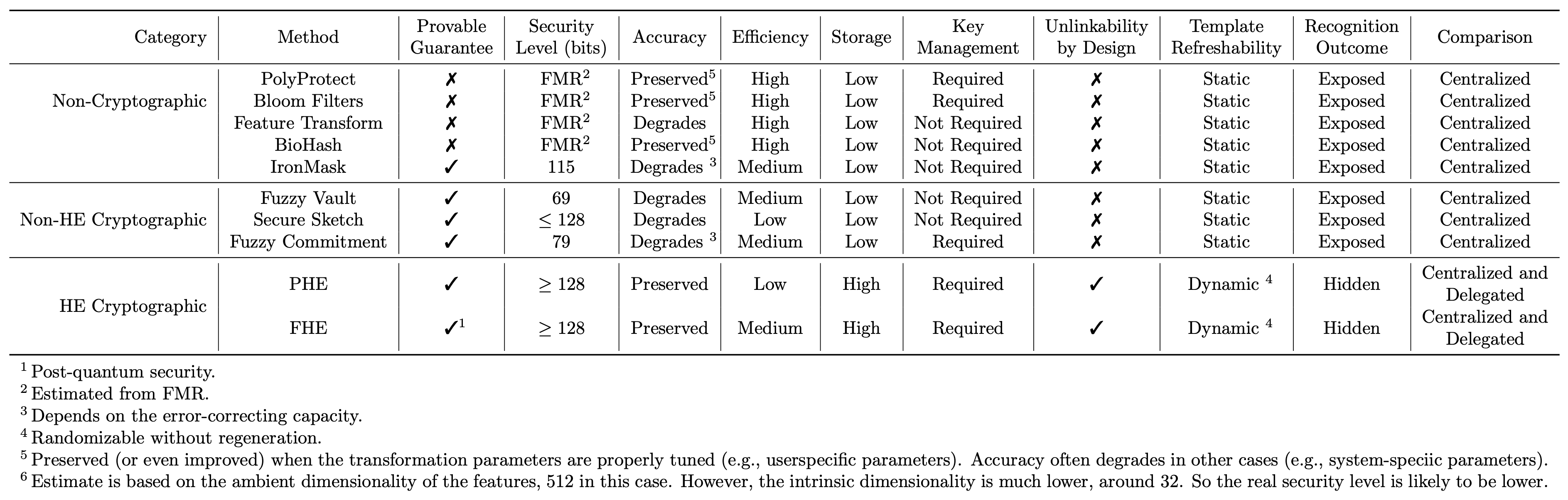 - Classical BTP criterion: recognition accuracy, irreversibility, renewability/unlinkability